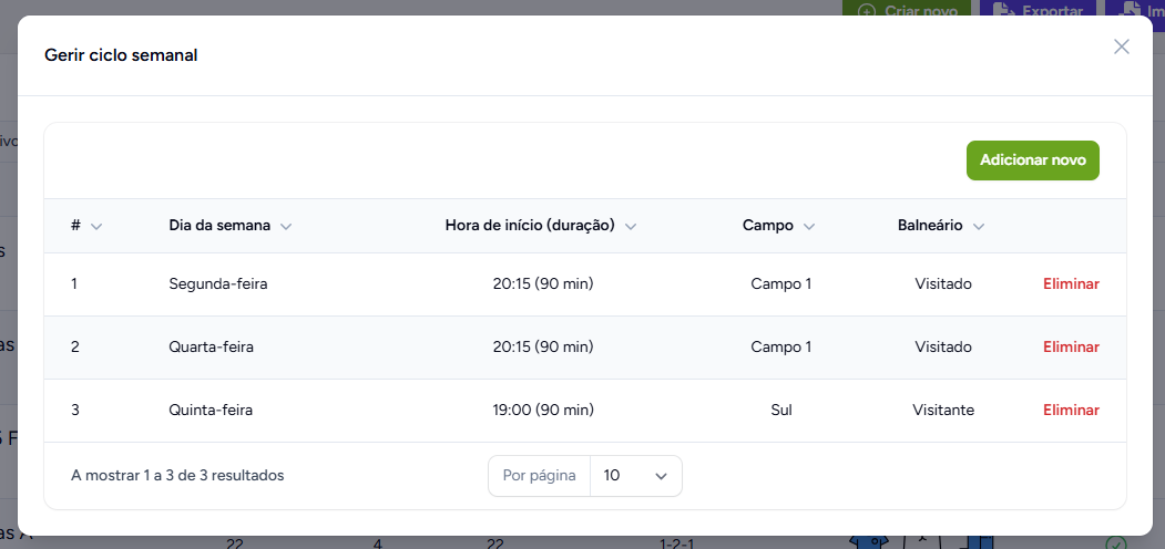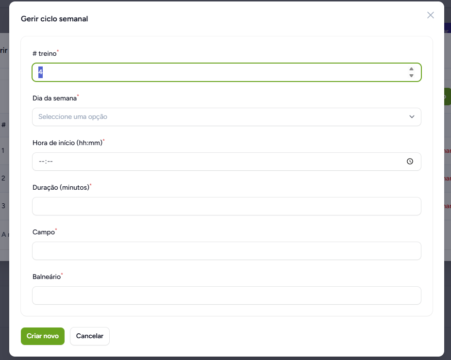 Através do botão Gerir ciclo semanal existente no menu opções da página equipa, podemos gerir o ciclo de treinos semanal. Ao clicar no botão gerir ciclo semanal será aberto um pop-up onde poderá ver informação referente aos treinos semanais.