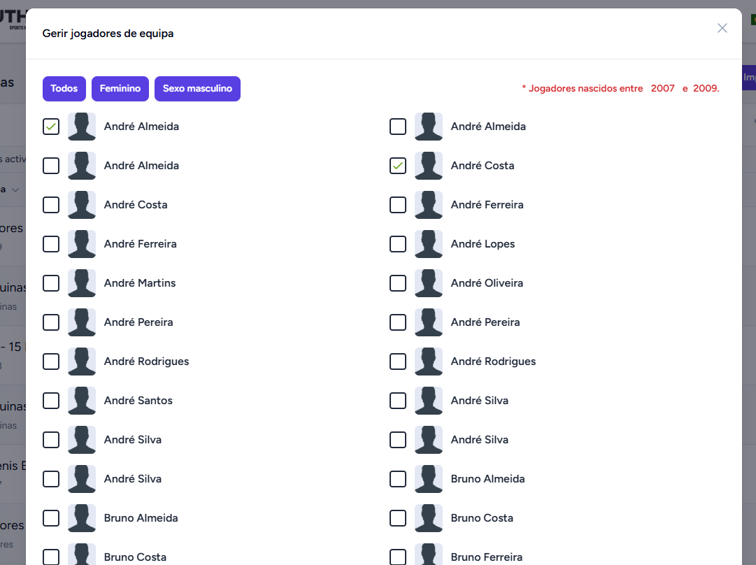 Podemos adicionar jogadores a uma equipa depois de os adicionar na plataforma clicando no botão (Gerir Jogadores) disponível no menu opções. Ao clicar será aberta uma lista com jogadores presentes na plataforma com como visto na imagem.