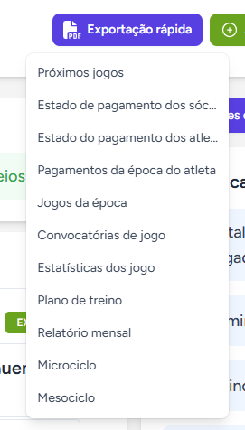 Na plataforma Youth PRO temos acesso a uma zona de exportação rápida, onde conseguimos obter relatórios relacionados com o clube.