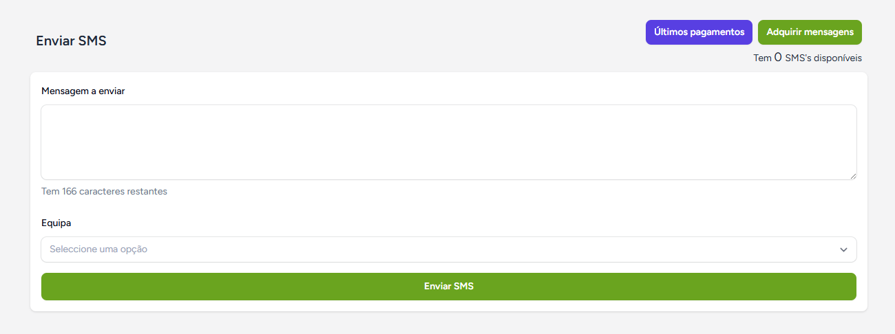 Na página inicial temos acesso ao botão “Enviar Sms” que nos leva até à área de mensagens.