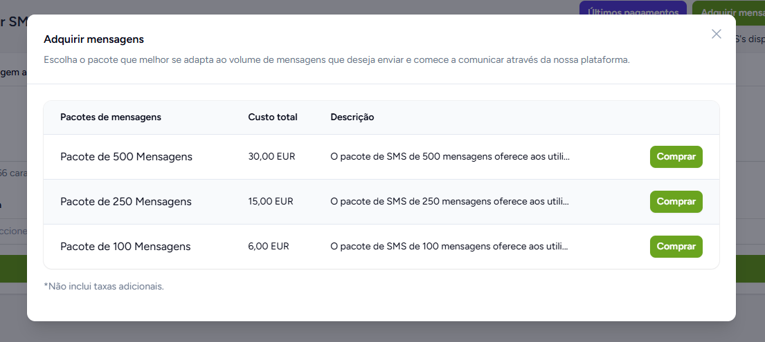 Podemos adquirir mensagens através da plataforma ao clicar no botão adquirir mensagens. Ao clicar será aberto um pop-up onde podemos escolher qual o pack a adquirir.
