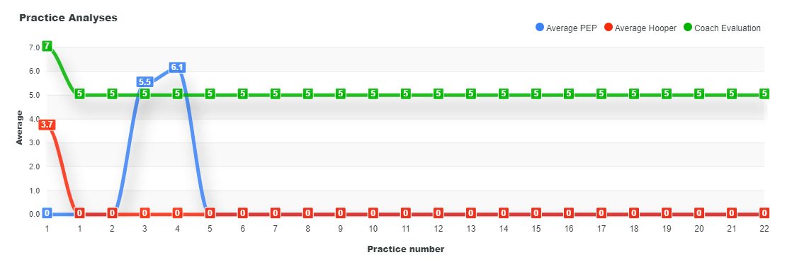 Ao clicar no botão “Mostrar Analises de treino” conseguimos ter acesso ao grafico com os seguintes valores: Questionario hooper, PSE e Avaliação do treinador.