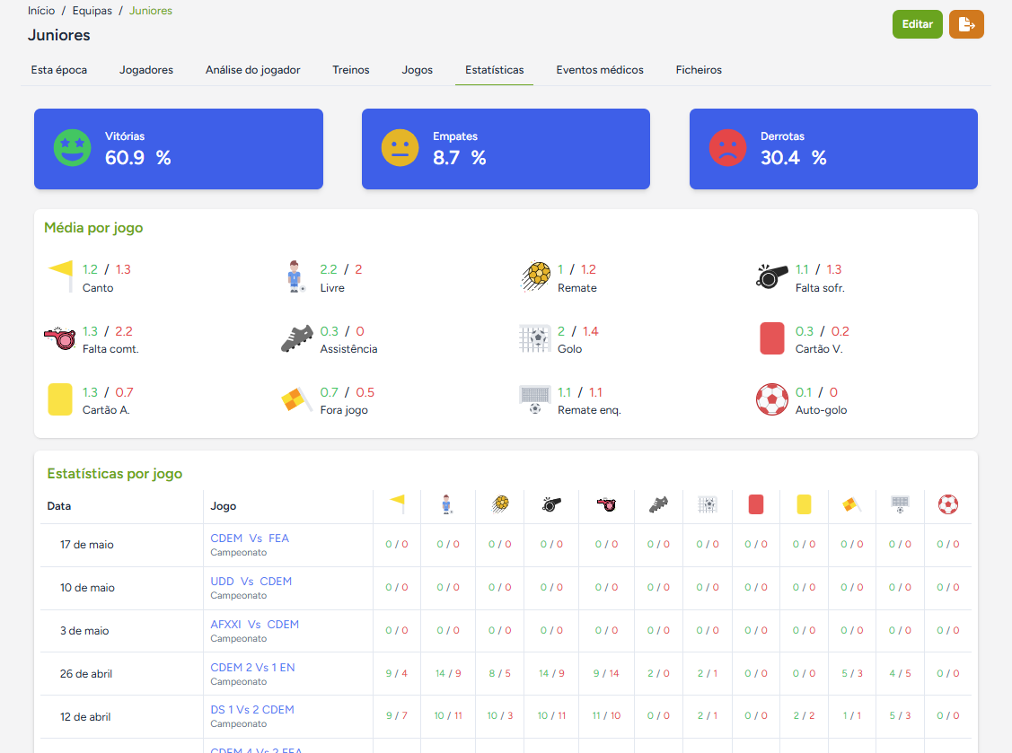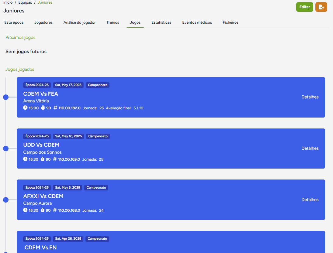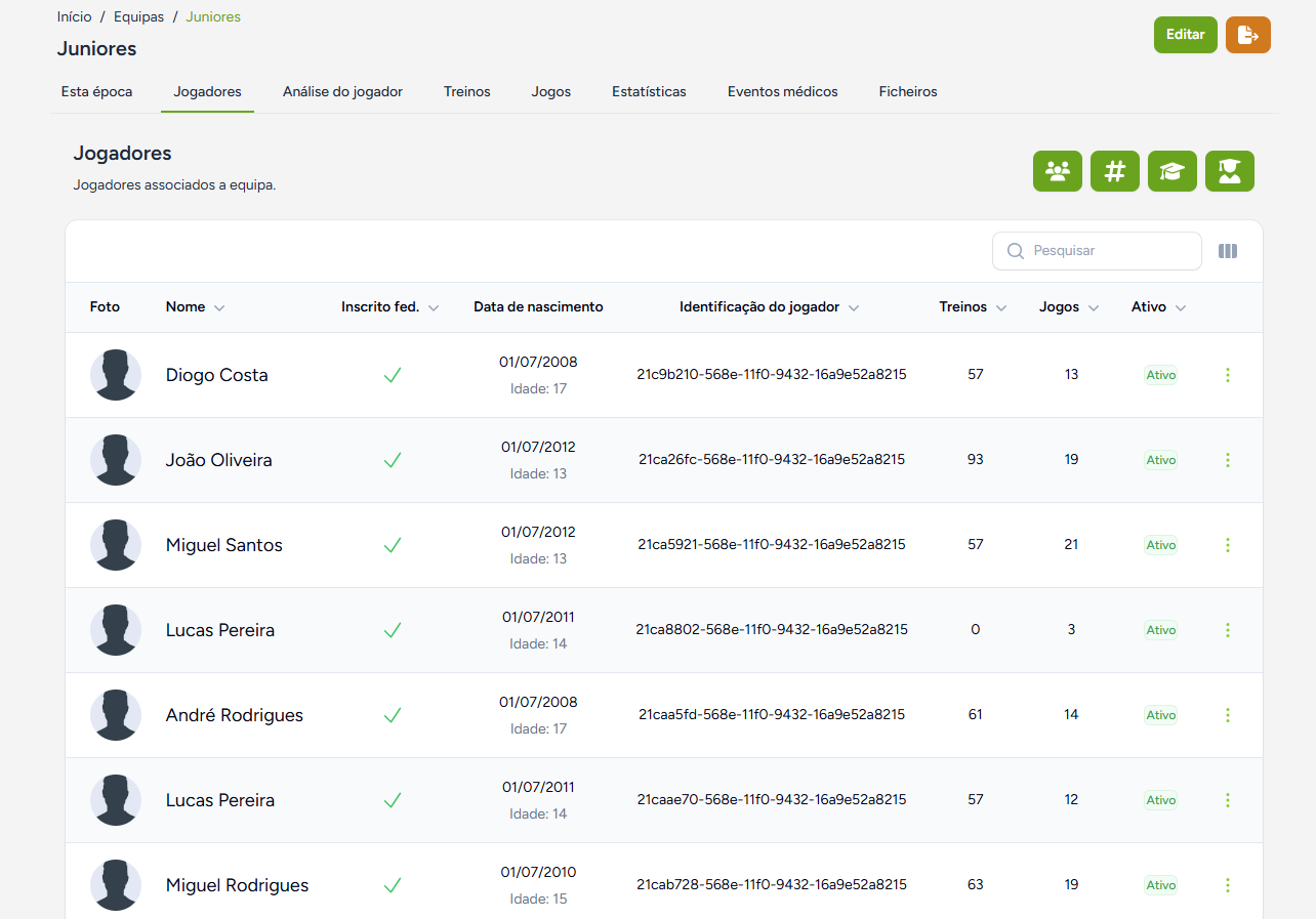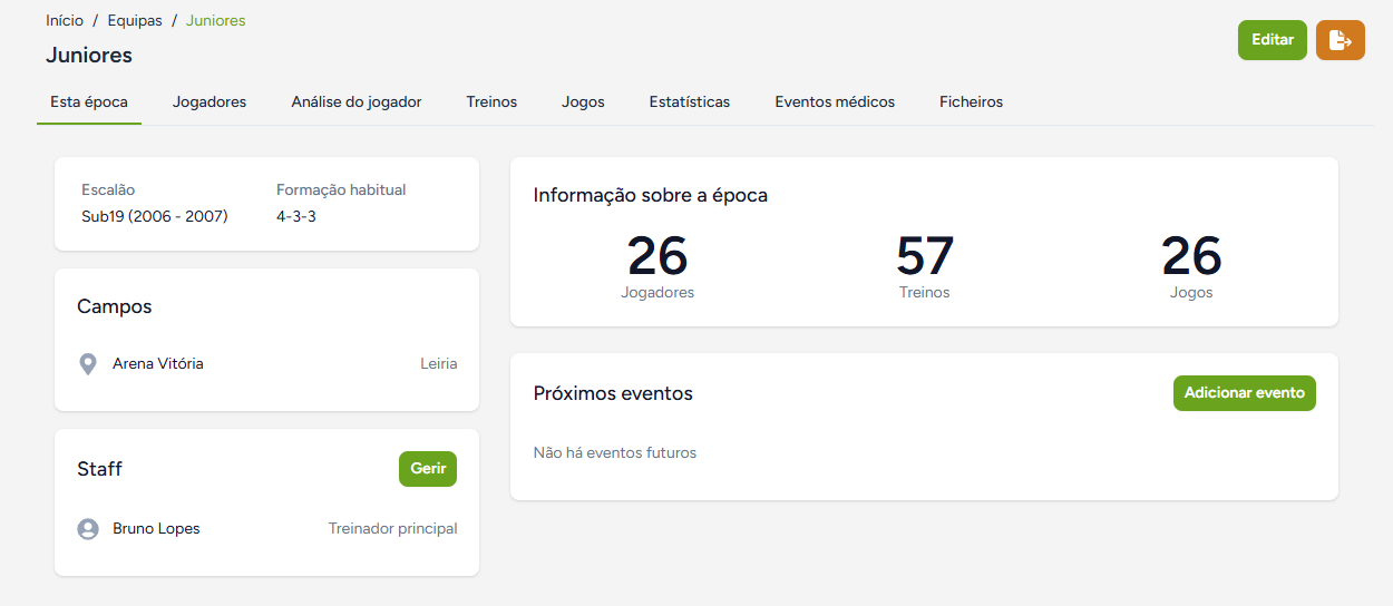 É aqui que podemos consultar todos os elementos relacionados com a equipa (Jogadores, Treinos, Jogos, Estatísticas, Eventos médicos e Ficheiros) como exportar vários ficheiros com informação acerca de equipa através do botão exportação.
