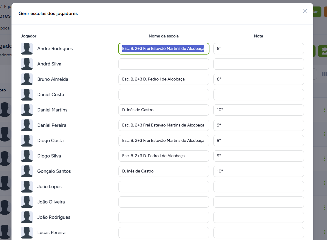 Através do botão cartola, conseguimos gerir as escolas e notas de cada jogador. Ao clicar, irá abrir um pop-up com a lista de jogadores presentes na equipa. Basta preencher o campo ”Nome da escola" com o nome da escola correspondente a cada jogador.