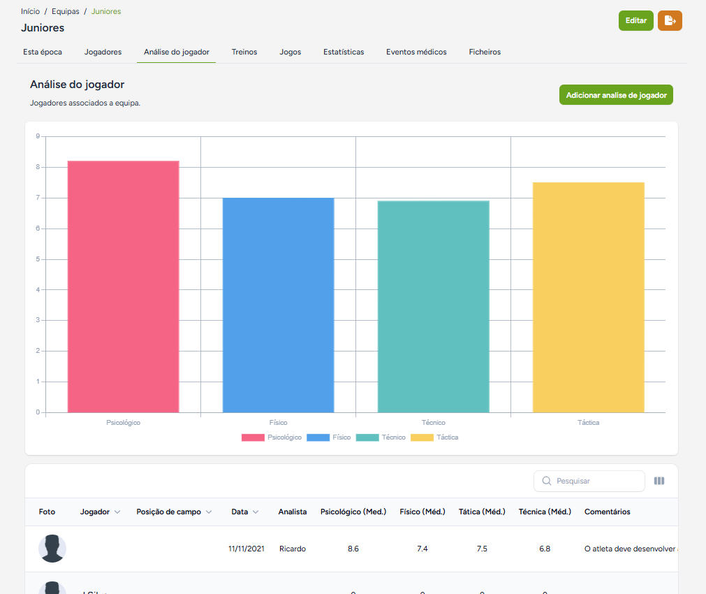 Na aba de analise de jogador da página de detalhe de equipa, temos acesso a todas as analises realizadas aos jogadores da equipa.