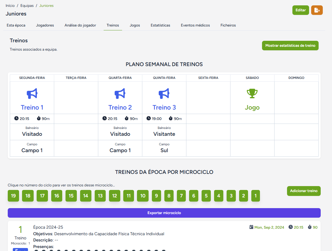 Na aba de treinos da página de detalhe de equipa, temos acesso ao ciclo de treinos semanais da equipa como também aos respetivos treinos por microciclo.