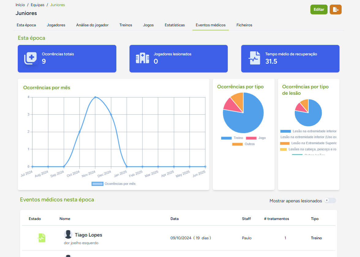 Na aba de eventos médicos da página de detalhe de equipa, temos uma visão geral acerca dos dados medicos relacionados com os jogadores da equipa.
