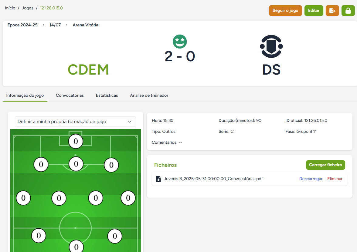Na página de detalhe de jogo conseguimos obter mais informação acerca do jogo. É aqui que podemos consultar todos os elementos relacionados com o jogo (Informação geral, convocatória, formação, estatísticas, analise de treinador, vídeos e ficheiros).