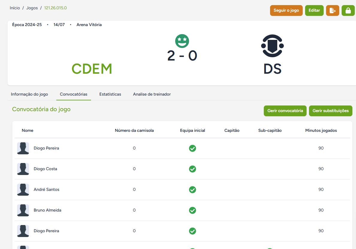 Podemos gerir a convocatoria de jogo através da aba convocatorias.