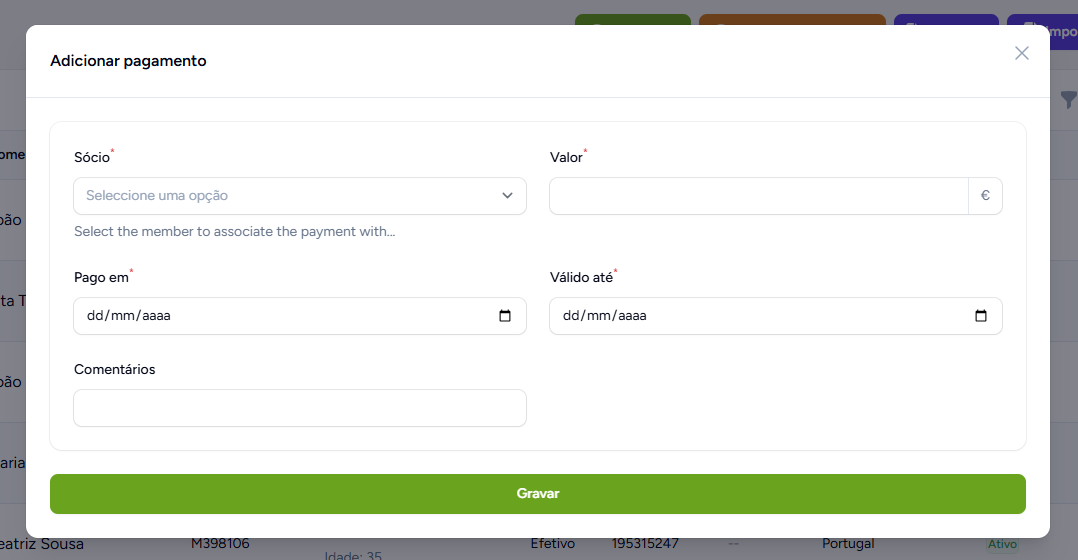 A plataforma Youth Pro no modulo de sócios permite registar o pagamento de quotas de cada sócio. Para registar um pagamento podemos clicar no botão "Adicionar pagamento" existente na pagina de sócios.