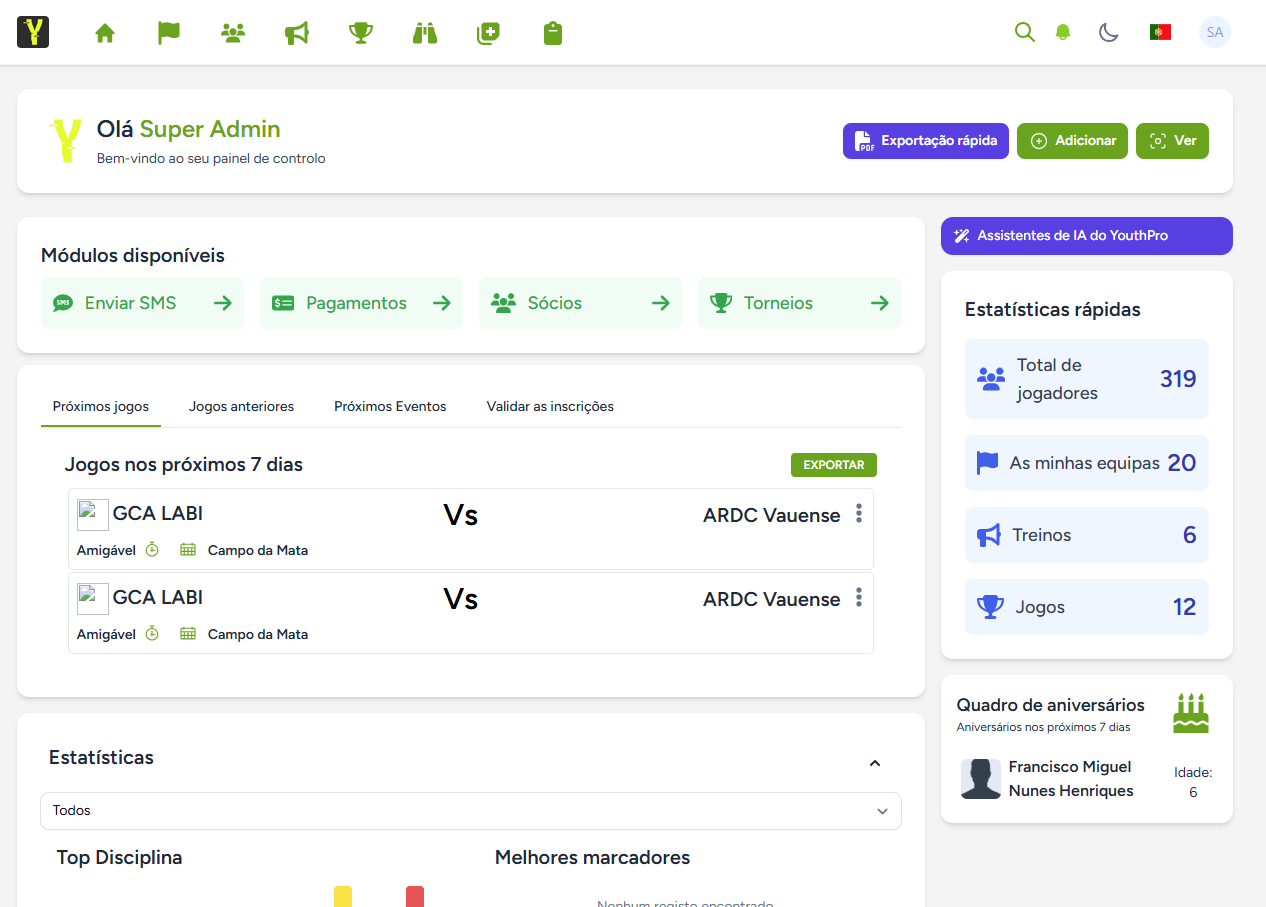 Com o módulo de Pagamentos, o clube centraliza toda a vertente financeira num único lugar, eliminando processos paralelos, folhas de Excel e falhas de comunicação com os encarregados.