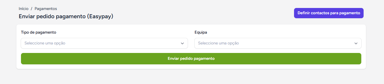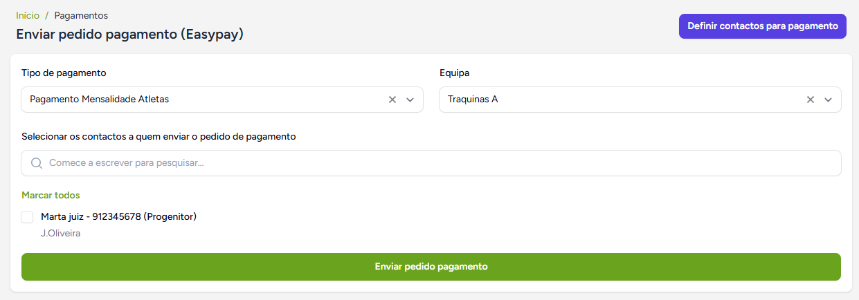 Para definir um contacto para pagamento temos disponível um botão na pagina de Enviar pedido de pagamento com o nome "Definir contactos para pagamento".