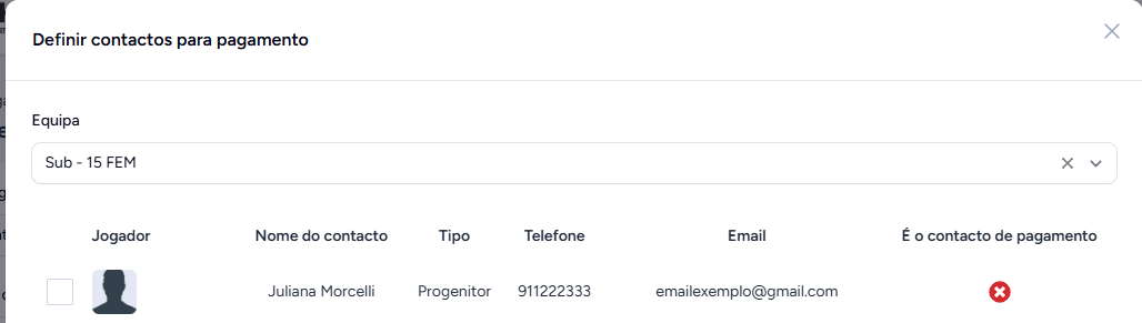 Para definir o contacto como de pagamento clicamos no quadrado disponível à esquerda da imagem de jogador.