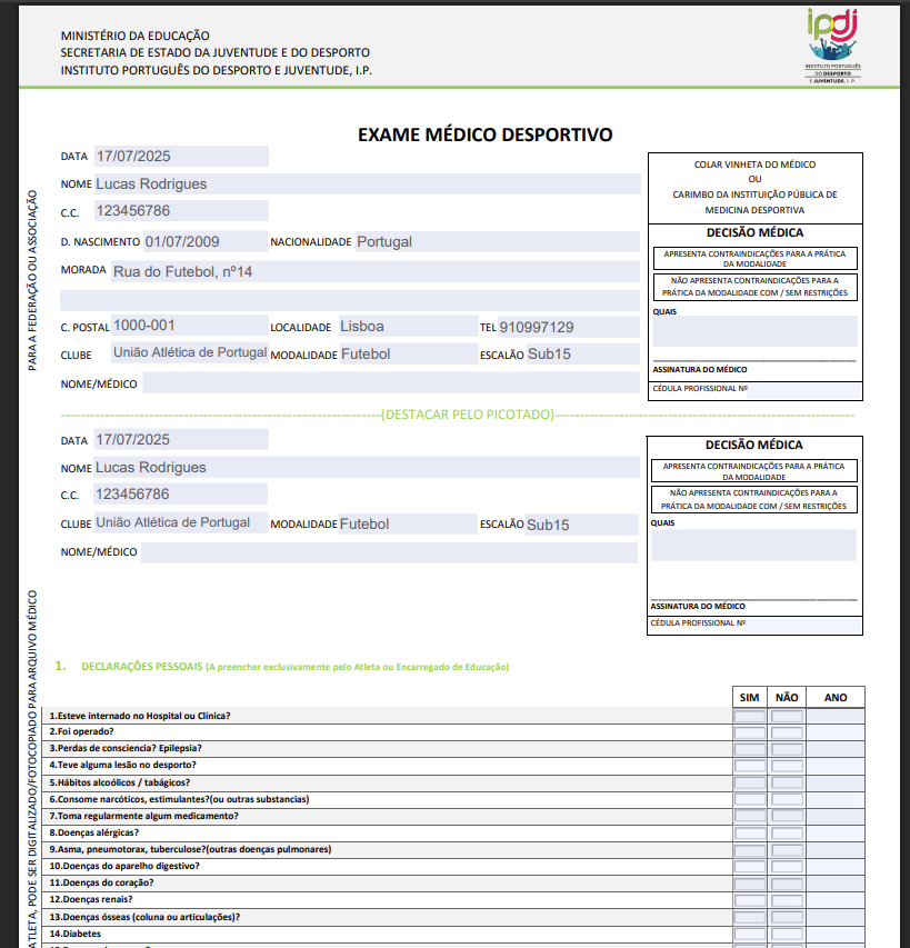 Após o aparecimento do menu só temos de clicar no botão gerar ficheiro médico de jogador e o ficheiro será automaticamente descarregado.