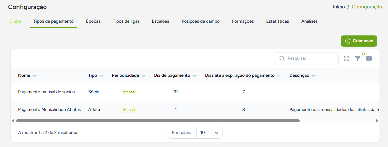 Na página de configuração, se a licensa de pagamentos estiver ativa existe, disponível a aba de tipos de pagamento. Aqui podemos configurar os tipos de pagamento disponíveis na plataforma.
