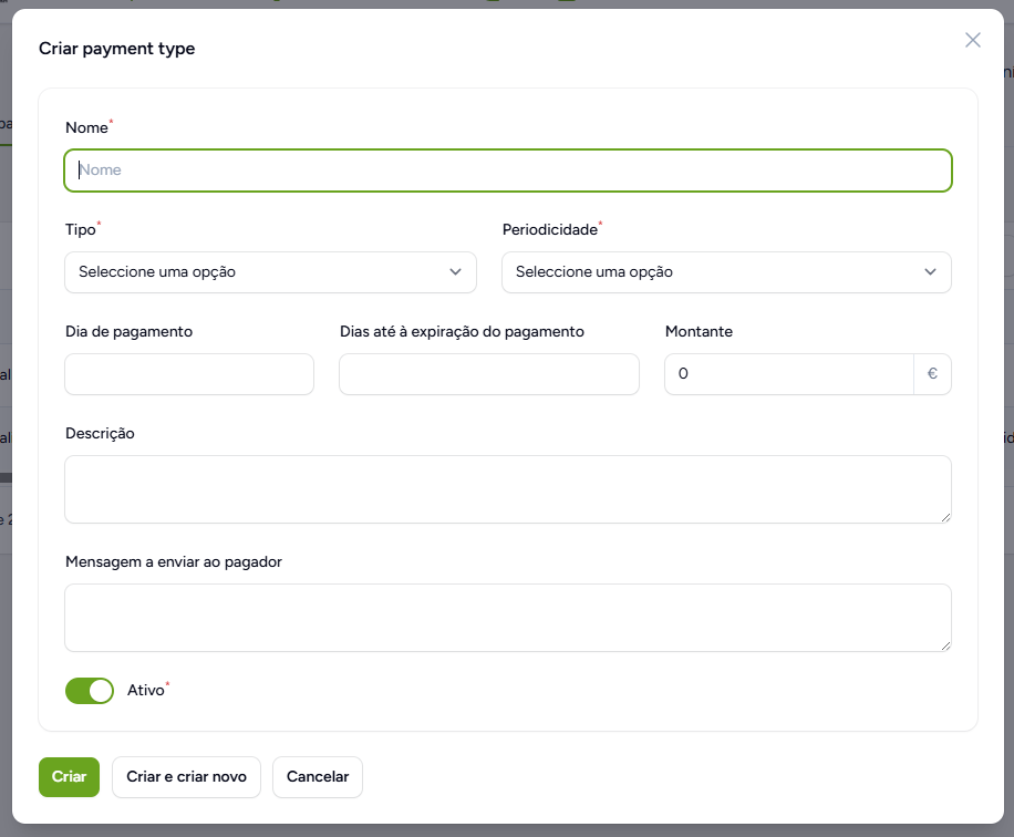Para criar um novo tipo de pagamento basta clicar no botão "Criar novo", ao clicar será aberto um pop-up como na imagem abaixo.