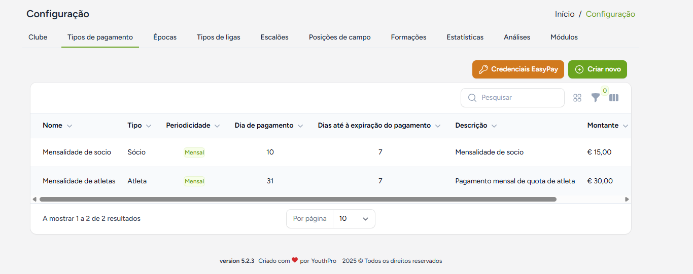 Após obter as chaves de API através do backoffice da EasyPay deverá inserir as mesmas na sua plataforma YouthPro.