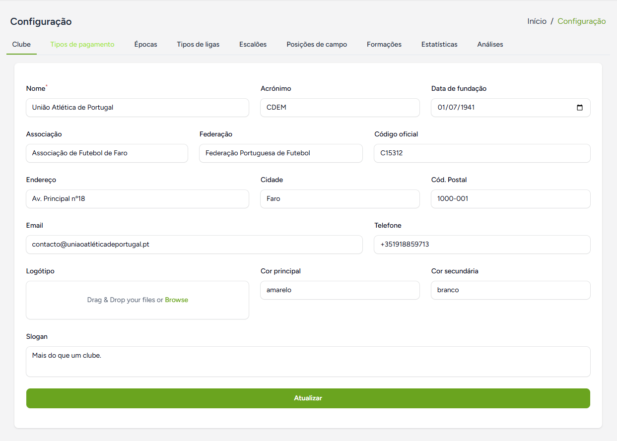 Começando com as informações sobre o clube. É nesta aba que são adicionadas as informações gerais relacionadas com o clube, tais como, nome, código oficial, federação, logotipo, etc...