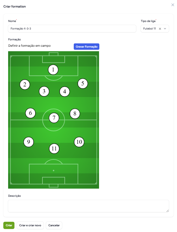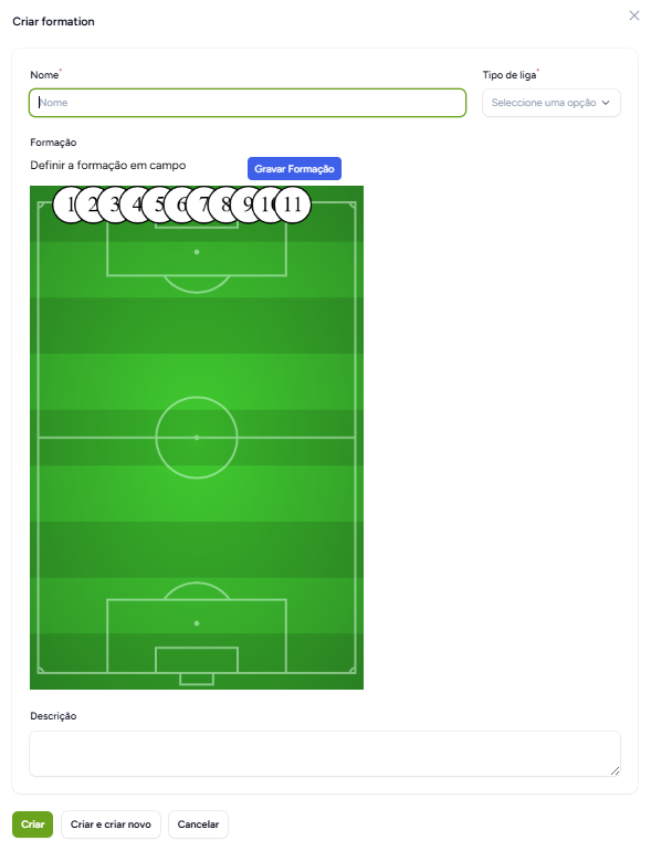 É aqui na aba Formações que podemos criar formações para associar a cada tipo de liga e equipa. Ao clicar no botão criar abrirá o pop-up mostrado na imagem. Escolhemos o tipo de liga através do dropdown e com isto conseguimos assim definir o número máximo de jogadores em campo.