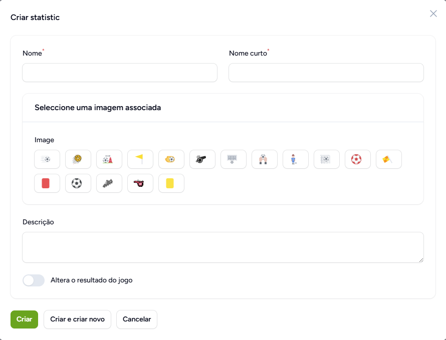 Na aba (Estatisticas) encontramos uma tabela onde adicionamos as estatísticas a registar durante os jogos.
