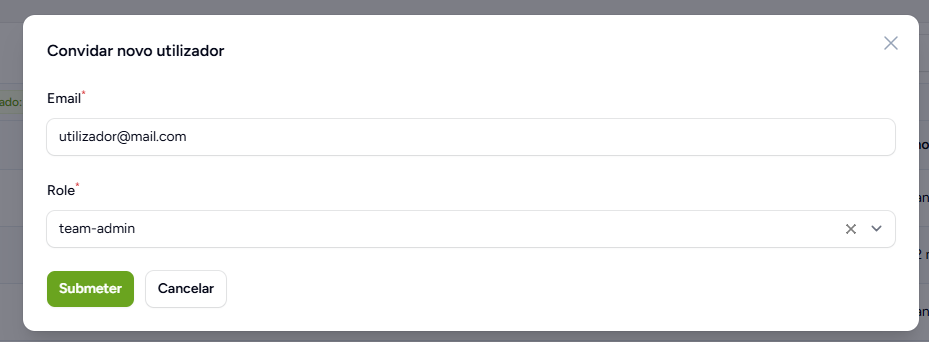 Para convidarmos novos utilizadores para a plataforma basta, clicarmos no botão existente na “Convidar novo utilizador” ao clicar será aberto um pop-up onde podemos inserir o email do utilizador a convidar e o respetivo cargo na plataforma.