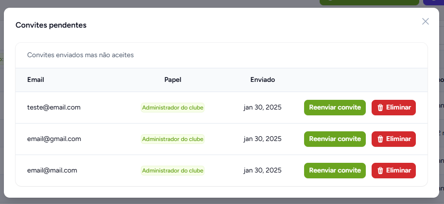 Após o seu preenchimento o convite será enviado e ficará pendente de aceitação, pode ver quais os convites pendentes através do botão “Convites pendentes” disponível na página utilizadores. Ao clicar será aberto um pop-up com a informação acerca do convite.