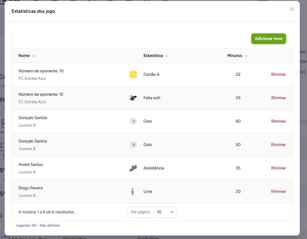 Podemos gerir as estatísticas de jogo ao clicar no botão Gerir estatísticas disponível no menu opções na tabela da página jogos.