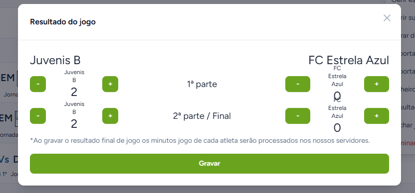 Pode efetuar o registo do resultado de jogo clicando no botão Resultado do jogo disponível no menu opções na tabela da página games. Ao clicar será aberto um pop-up que contem um marcador, basta clicar no botão mais para adicionar um ponto ao resultado ou clicar no botão menos para subtrair.