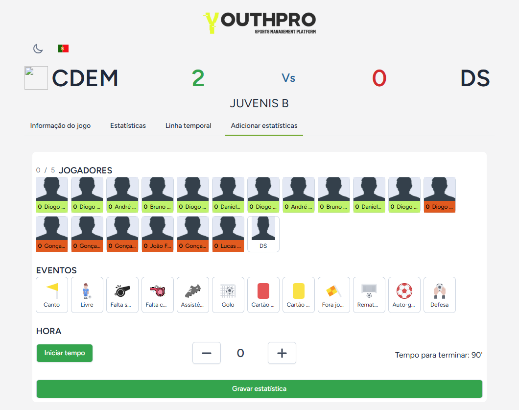 Basta selecionar a equipa, o respetivo jogador, a estatística e o minuto que corresponde.