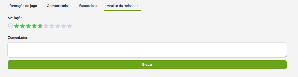 Para adicionar a avaliação do treinador ao jogo, podemos faze-lo através da aba “analise de treinador” existente na pagina de detalhe de jogo.