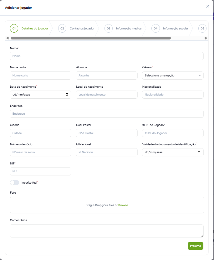 É na página Jogadores que temos acesso detalhado a uma lista de jogadores inscritos na plataforma. Para o processo de criação de um jogador basta preenchermos o formulário com a informação necessária.
