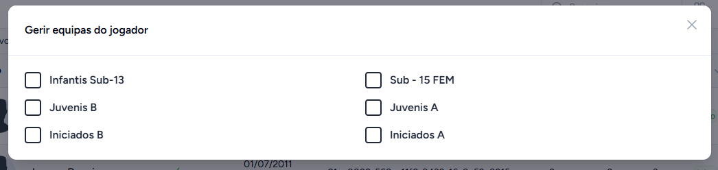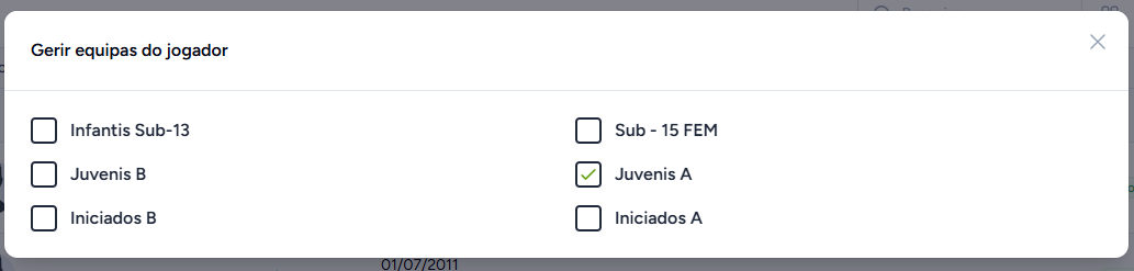 Para associar uma equipa a um jogador basta clicar no quadrado vazio existente à esquerda do nome. Depois de adicionado ficará preenchido com um certo.