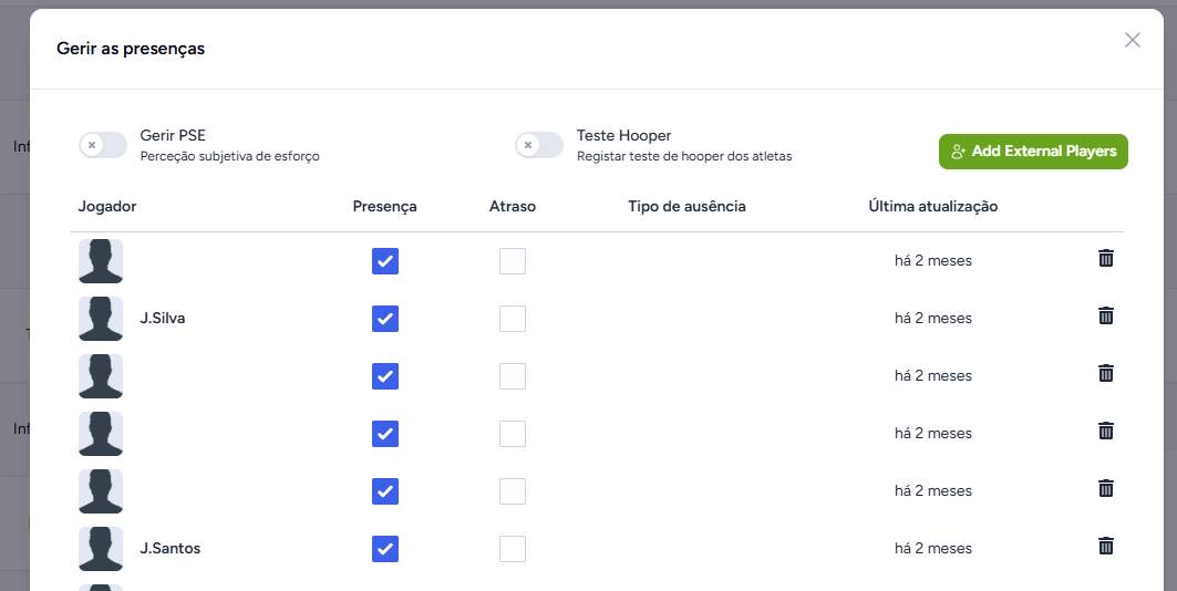 Para efetuar o registo de presenças de cada treino, clicamos no botão Gerir presenças disponível no menu opções na tabela da página practices. Ao clicar será aberto um pop-up que contem os jogadores associados à equipa do treino.
