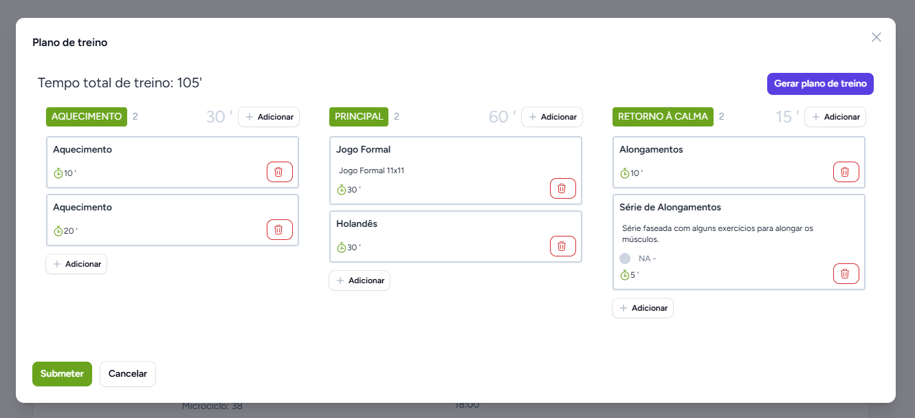 É possivel gerar o plano de treino para pdf através do botão Gerar plano de treino.