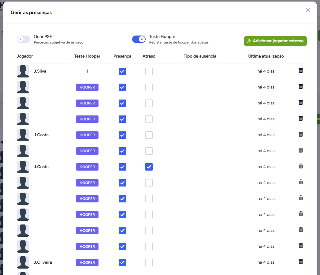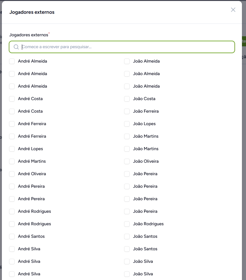 Ao clicar será aberto um pop-up onde poderá selecionar o jogador externo a adicionar ao treino.