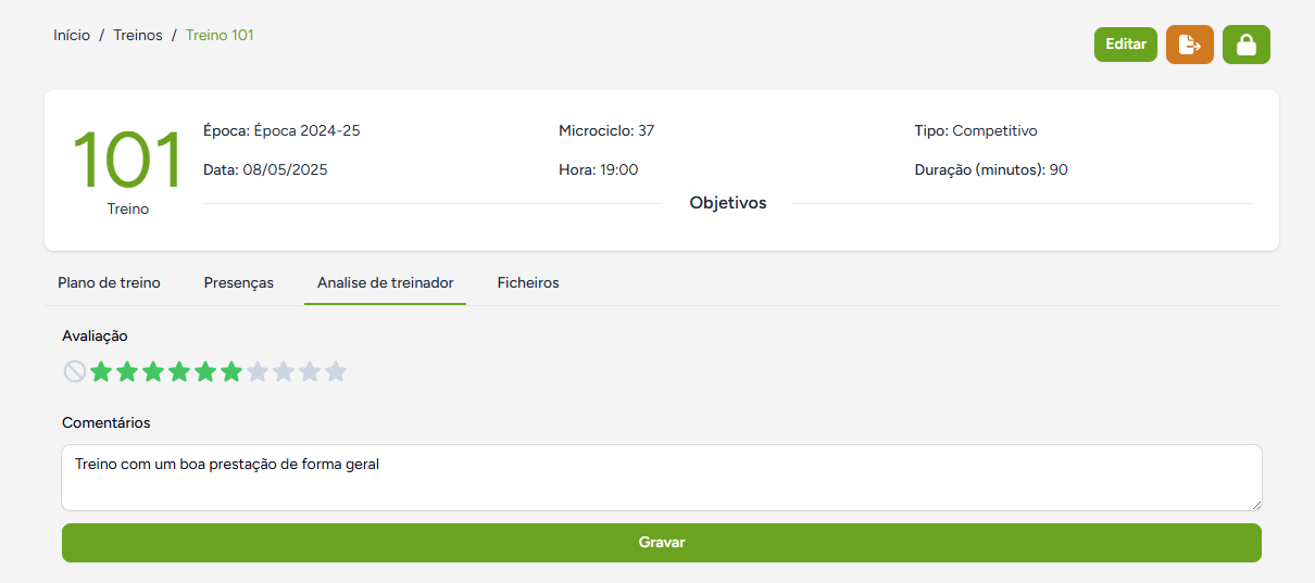 Ao preenchermos os dois campos existentes (Avaliação e Comentários) basta clicar no botão gravar e a informação ficará anexada ao treino.